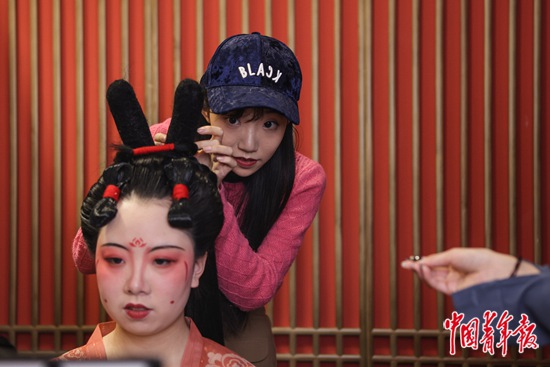 张子豪是北京民族乐团演出运营部项目主管,担任“走进颜料会馆”文艺演出的执行导演。和他一样的年轻人是乐团的主要力量,给“会馆有戏”带来了更多创新和生机。根据会馆场地小的特点,乐团特意对节目进行了编排,并根据不同会馆的特色进行调整。“比如颜料会馆由山西颜料、桐油商人建于明代,所以我们安排了山西省新绛县的绛州鼓乐表演;颜料会馆离梅兰芳故居不远,因此我们又选择了梅兰芳大师的代表作《贵妃醉酒》。”张子豪说。