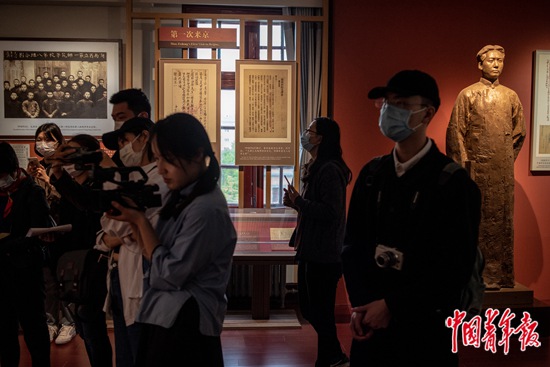 2021年4月21日,北京,媒体记者在北大红楼展厅内参观主题展览。展览介绍了青年毛泽东两次来京的经历,展示了他确立马克思主义信仰的思想轨迹。 中青报·中青网记者 李隽辉/摄