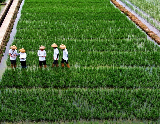 7月4日,年轻科研人员在水稻育种实验田里工作。陈家乐/摄