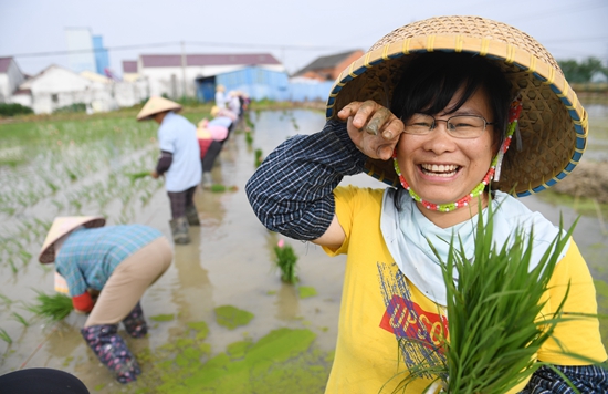 5月31日,周红英博士在水稻育种实验田里插秧。苏玲/摄