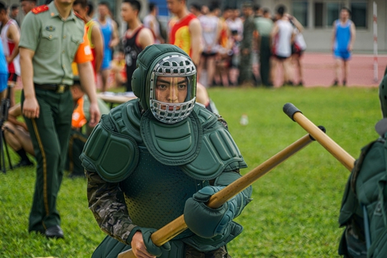 近日,武警北京总队执勤第九支队举行“跨越杯”军事体育运动会。图为参赛队员进行刺杀对抗。彭文彬/摄