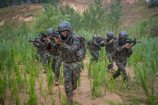 盛夏时节,第71集团军某合成旅联合陆航部队组织的一场机降综合演练在苏北某演训场拉开战幕,战术演练中突下暴雨,步兵班组搜索前进。胡祥伟/摄