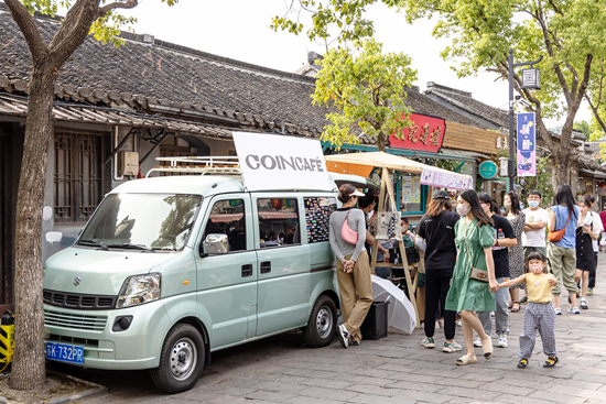 5月22日,江苏扬州“唤醒”咖啡节热闹非凡。图为小面包车改装的咖啡小店。视觉中国供图