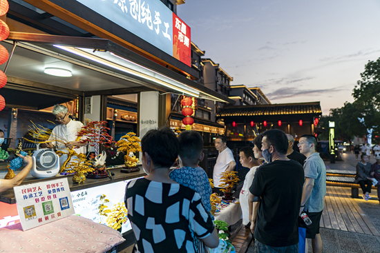 6月6日傍晚,浙江绍兴,鲁迅故里步行街市集上的手艺小店吸引游客市民。视觉中国供图