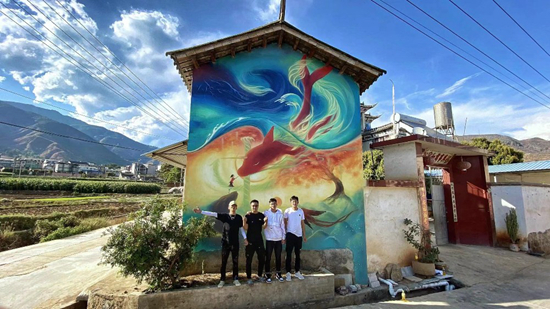 刘小备(左一)和团队伙伴在墙绘前合影。受访者供图
