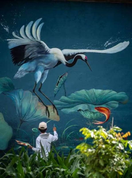 做墙绘的同时,刘小备在家乡开起了自己的工作室,一边接商业订单一边坚持公益墙绘,如今已完成了近40幅画作。刘小备见证了新农村建设的飞速发展,他愿意把充满勃勃生机的新农村展现给更多人。