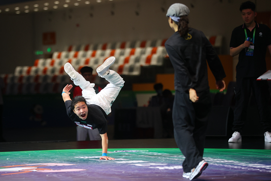 2021年9月25日,第十四届全运会霹雳舞项目女子冠军赛在江苏省南京市溧水极限运动馆举行。图为河南选手刘清漪(左)在比赛中。视觉中国供图