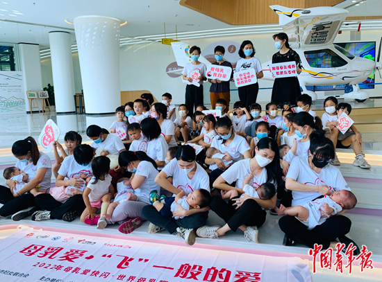 近日,在广州市新儿童活动中心的飞粤号飞机前,12位怀抱宝宝的妈妈以集体哺乳的行为艺术,呼吁大众关注母乳喂养及母乳捐赠救治公益行动。这是2022年世界母乳喂养宣传周之“母乳爱·‘飞’一般的爱”母乳喂养公益快闪活动。