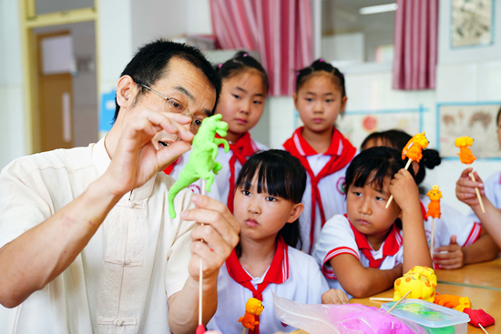 7月28日,在山东省德州市齐河县祝阿镇马坊社区乡村“复兴少年宫”,王向东在教小朋友捏面塑。
