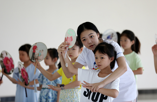 7月31日,在湖南省昆剧团教室,演员指导孩子学习昆曲动作。近日,暑期少儿昆曲公益课堂在位于湖南省郴州市的湖南省昆剧团开班,60多名“小戏迷”认真学习体验昆曲,感受戏曲文化的魅力。李科/摄(新华社发)