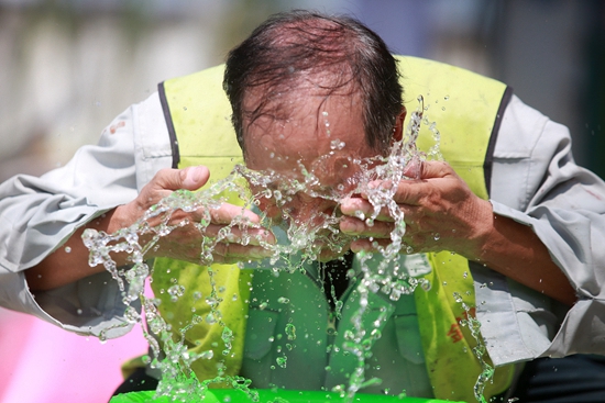 8月8日,江苏省扬州市,在江都区一处建筑建工地上,工人正在洗脸降温。视觉中国供图