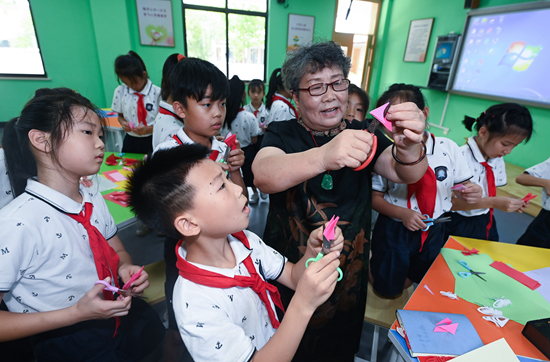 8月10日,湖州市吴兴实验小学的学生在“博学课堂”上学习剪纸。从8月上旬开始,位于浙江省湖州市织里镇的吴兴实验小学开启了以传统乡土文化为落脚点的“博学课堂”,教授孩子们剪纸、扎染、刺绣、雕版等乡土特色文化课程,让学生们充分了解和传承乡土文化,充实暑期生活。新华社记者 徐昱/摄