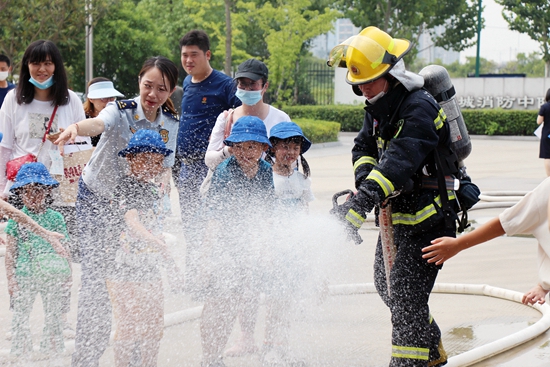 苏州相城区消防救援大队开展“2022年暑期消防沉浸式体验”青少年夏令营活动。图为消防员手把手教授小朋友使用消防水枪。陈南飞/摄