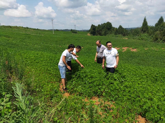 赵国伟(左一)和同事讨论中药材决明子的种植技术问题。受访者供图