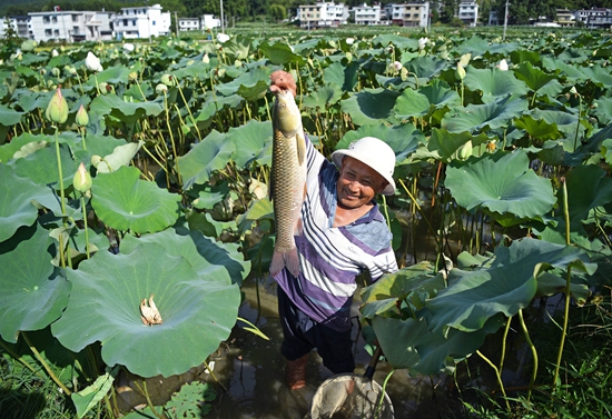 近年来,江西省抚州市广昌县依托当地莲种植优势,大力发展“莲鱼共养”的特色农业生产模式,有效提高了土地利用率和农产品品质。据了解,广昌县莲鱼综合种养面积达1.9万亩,带动900余户农户增产增收。新华社记者 万象/摄