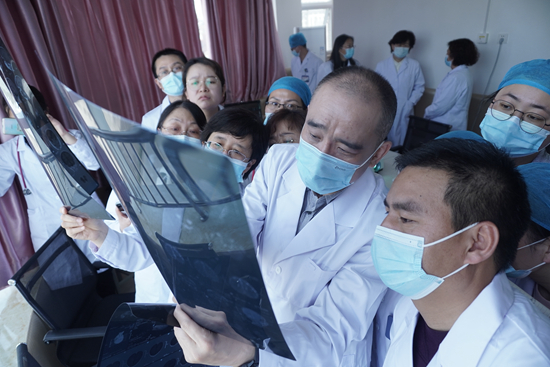 2021年3月,在宁夏儿童医院的全科疑难病例讨论会上,姜玉武(右二)正给当地医生分析脑MRI图像。受访者供图