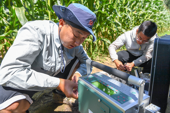 8月17日,沙野(右)和崔帅在试验田里组装光合作用测量系统。