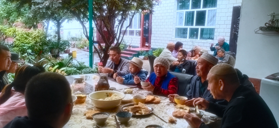 8月10日,滞留游客马雪丽一行19人在特克斯县免费居住的年年顺民宿享用临行前的最后一顿午餐。马悦/摄