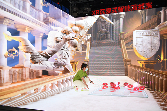 8月30日,工作人员在“新技术 融创新高地”2022中国新媒体技术展上展示XR沉浸式智能演播室。当日,2022中国新媒体大会在湖南长沙开幕,大会主题为“新主流 新征程”。新华社记者 薛宇舸/摄