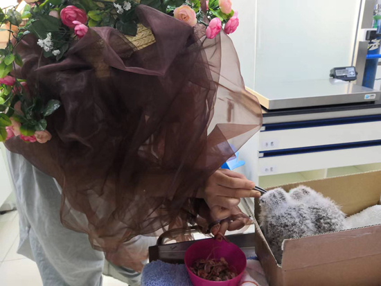 康复师伪装成一朵花,给雏幼鸟喂食。
