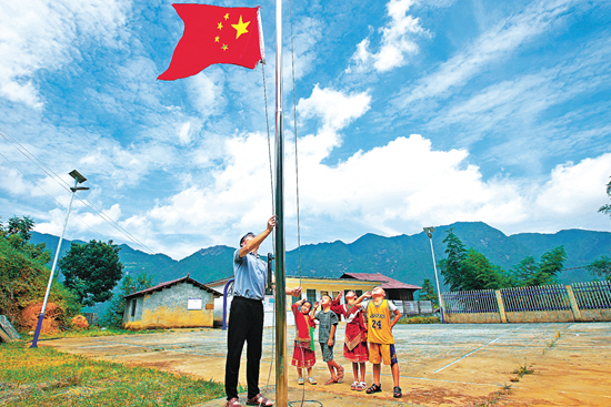 8月30日,广西融水苗族自治县白云乡林城村麻耶瑶寨教学点开学,师生们在升国旗、领新书和上新课等教学活动中迎来新学期。麻耶教学点是一所微型小学,多年来只有一名教师,2022年秋季学期只有4名学生。视觉中国供图