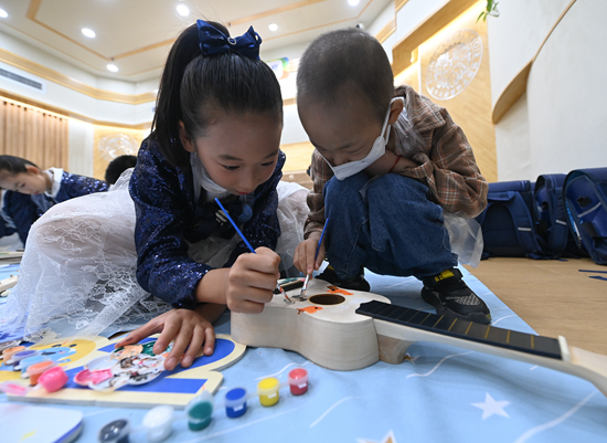 8月29日,在北京市海淀区,羊羊(化名,右)和天使童声合唱团成员一起绘制尤克里里。
