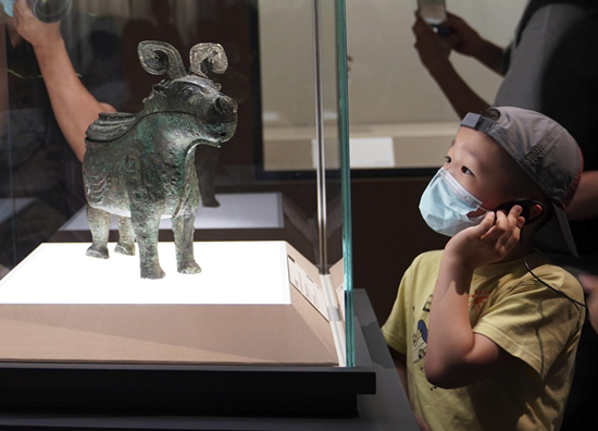 7月30日,小观众在上海博物馆举行的“宅兹中国——河南夏商周三代文明展”上参观。新华社记者 任珑/摄