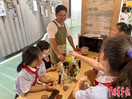正在世界艾草博物馆研学参观的,还有蕲春县第四实验小学5年级的学生,他们观看李时珍纪录片、在工作人员的指导下辨识多种常见的中草药材,了解艾叶的基本功效,体验制作艾香和艾草手工皂等。工作人员告诉记者,这些活动不仅可以让学生们更好地了解艾草的功效,还能增强动手能力,拓宽视野,同时缓解学习压力,很受学生的喜爱。