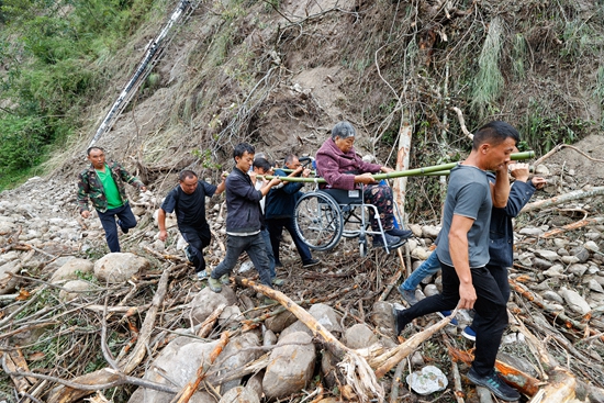 9月8日,在四川省甘孜藏族自治州泸定县磨西镇附近,人们将一位从磨子沟村疏散出来的受伤人员抬出。记者从9月8日晚在雅安市石棉县召开的四川省“9·5”泸定地震抗震救灾省市(州)县前线联合指挥部新闻发布会上获悉,截至8日12时,四川泸定地震已经造成86人遇难,其中甘孜州50人遇难、雅安市36人遇难,另有35人失联。新华社记者 沈伯韩/摄
