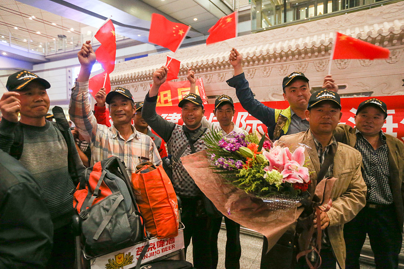 2015年3月31日,首批从也门撤离的104名中国务工人员乘飞机抵达北京首都机场。 人民视觉供图