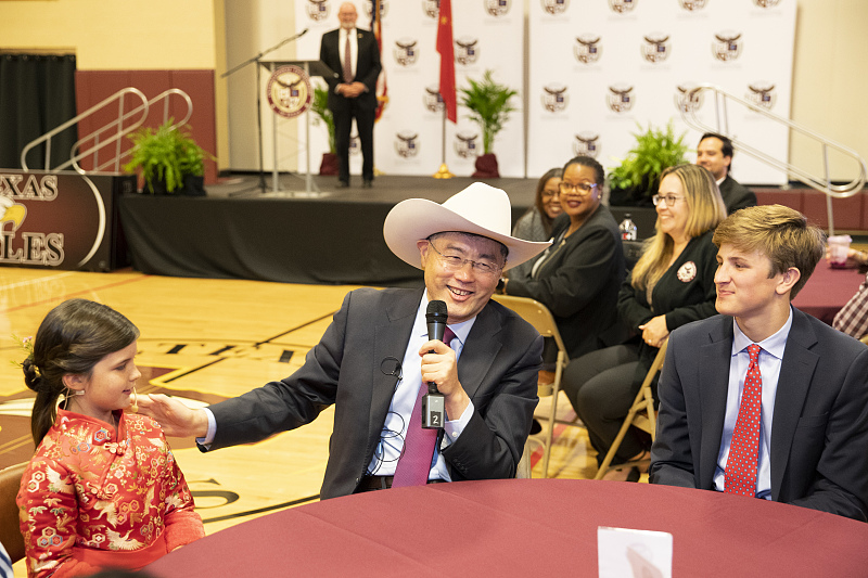 今年5月31日,中国驻美大使秦刚访问美国得克萨斯州国际领袖学区加兰高中,跟美国学生一起玩词语接龙游戏。 人民视觉供图