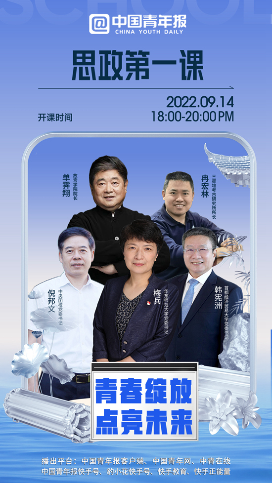 9月14日18时,《思政第一课》将在中国青年报客户端、中国青年网、中青在线、中青报快手号、豹小花快手号、快手教育、快手正能量开播。《思政第一课》是中国青年报社联合全国16所高校,在2022年大学生开学季打造的一档特别节目,引导青年学子扣好人生第一粒扣子,厚植爱国主义情怀,坚定“四个自信”,在青春的赛道上奋力奔跑。