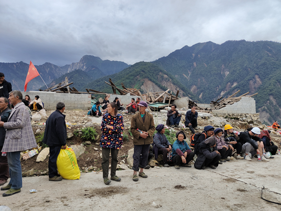 9月6日,四川泸定,湾东村村民在红花岗上等待撤离。 肖丽/摄