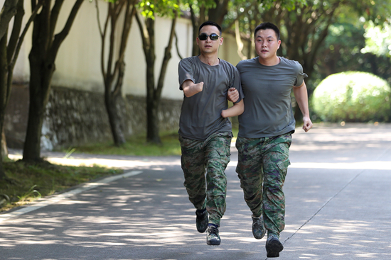 战友简云陪着杜富国进行体能训练。 闵宁/摄