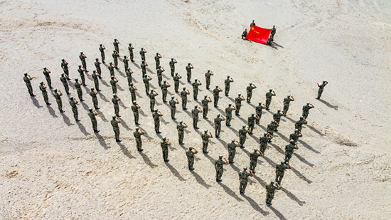 “八一”建军节,空降兵某旅官兵在戈壁沙漠面对军旗庄严宣誓。 许洋/摄