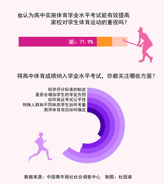 上周,中国青年报社社会调查中心联合问卷网(wenjuan.com),对2008名学生家长进行的一项调查显示,将高中体育成绩纳入学业水平考试,86.7%的受访家长表示支持,71.9%的受访家长认为能有效提高家校对学生运动的重视。科学评分标准如何制定、是否会增加学生学业负担、如何保证考试公平性是受访家长关注的三大问题。