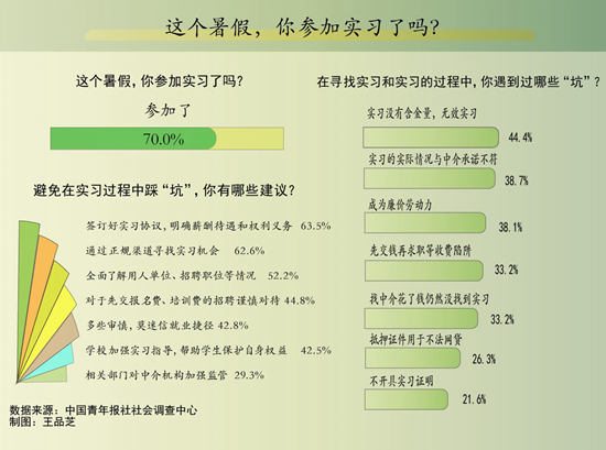 日前,中国青年报社社会调查中心联合问卷网(wenjuan.com),对2007名受访大学生进行的一项调查显示,70.0%的受访大学生在暑假参加实习了,44.4%的受访大学生遇到过实习没有含金量,无效实习的情况。避免在实习过程中踩“坑”,63.5%的受访大学生建议和公司签订好实习协议,明确薪酬待遇和权利义务,62.6%的人建议通过正规渠道寻找实习机会。