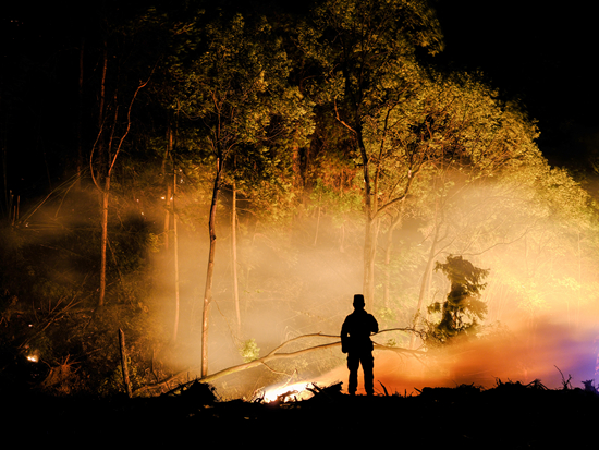 8月25日,重庆市大足区,一名消防员正在观察夜间的火势。川渝地区的森林防火期一般在冬春季节,今年8月下旬,四川省森林消防总队20年来第一次在秋季扑救森林火灾。