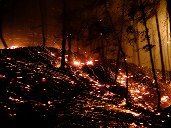 8月25日,重庆市大足区,山火燃烧后形成很多火星。