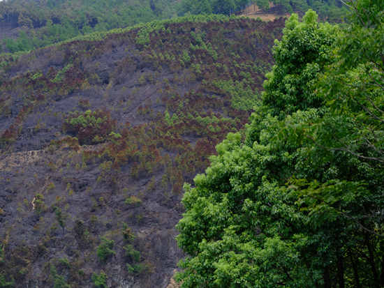 8月28日,四川省华蓥市,燃烧过的树木与鲜活的树木形成鲜明对比。