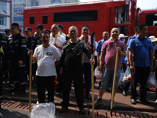 8月28日,四川省华蓥市,志愿者们拿着砍刀等工具,准备前往火场配合森林消防队伍扑火。