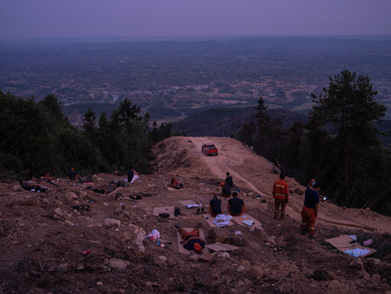 8月25日,重庆市大足区,消防员为了防止扑灭的区域复燃,席地而睡进行看守。天刚蒙蒙亮,远处是正在苏醒的城市。
