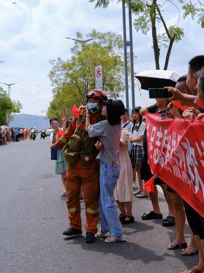 重庆的火线实在太长了。很难想象,特勤大队和阿坝支队的战友分别带着几百人,从两个方向用420根管带沿着火线铺了10多公里,硬生生把水从山脚引到山顶,送到火场一线。管带两旁的志愿者背着西瓜、冰水、热食上上下下;正在休假中的重庆籍战友李浩带着母亲和姐姐赶到火场,他上火场后,他的家人就留下来为我们做起后勤保障。互不相识的1000多人,就因为这场火,被拢在了一起。