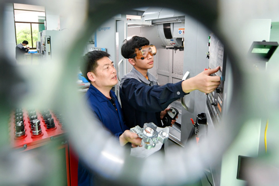 2021年4月19日,浙江省湖州市长兴县职业技术教育中心学校开放式实训中心,数控专业学生正在教师指导下赶制来自浙江中德自控科技股份有限公司的楔形块产品。视觉中国供图(资料图片)
