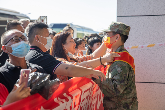 9月20日,浙江台州,新兵启程前与家人告别。当日,2022年秋首批新兵胸戴大红花,启程奔赴军营,为国防建设贡献青春力量。潘侃俊/人民视觉