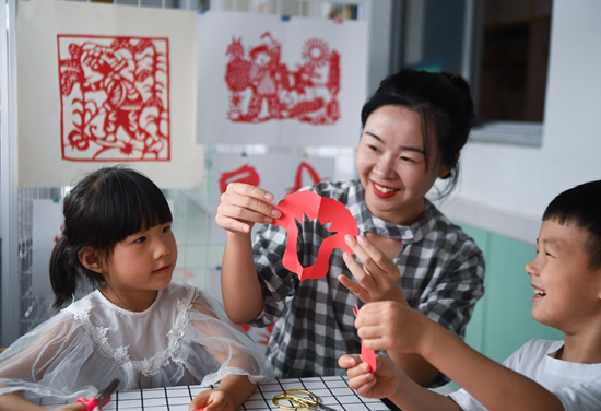 9月20日,老师指导孩子们剪出青菜造型的剪纸作品。