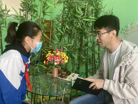 张长成给学生做心理咨询。