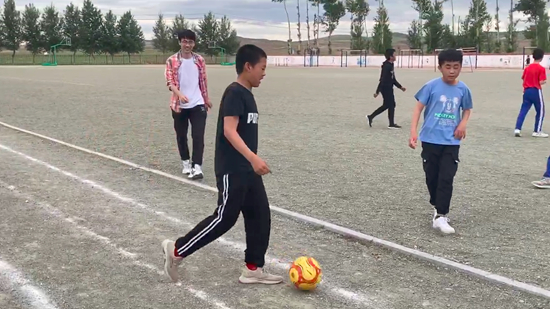 张长成和学生踢足球。