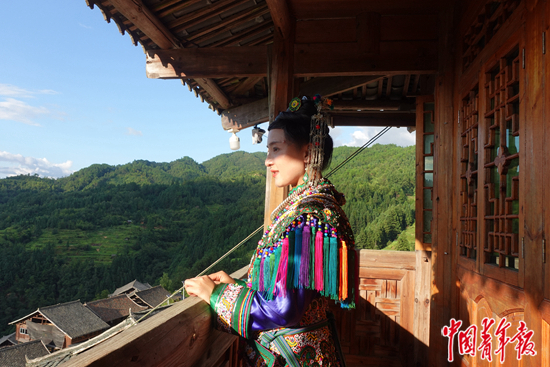 晚寨侗寨90后村干部吴帮云穿着侗族服饰在家中的阳台上,这里也是她的直播地之一。