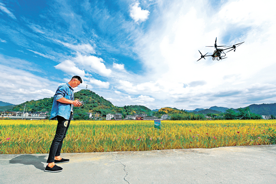 9月21日,在杭州市临安区昌化镇后营村,种粮大户汪强操作农用无人机给水稻施肥。汪强与家人承包了1000多亩稻田,使用现代化农用机械进行规模种植。
